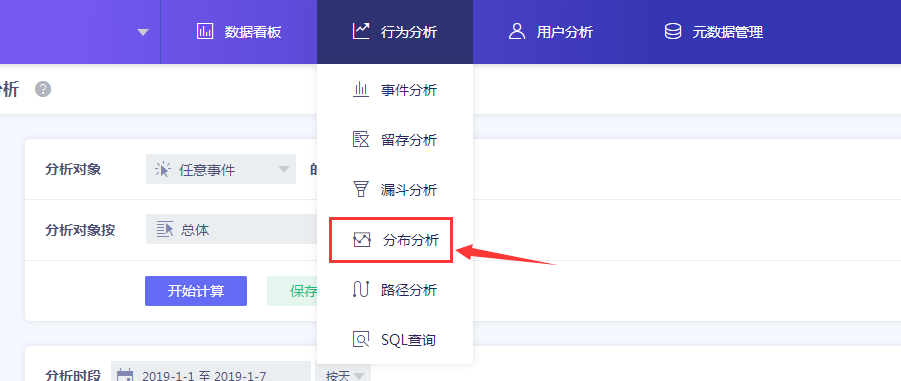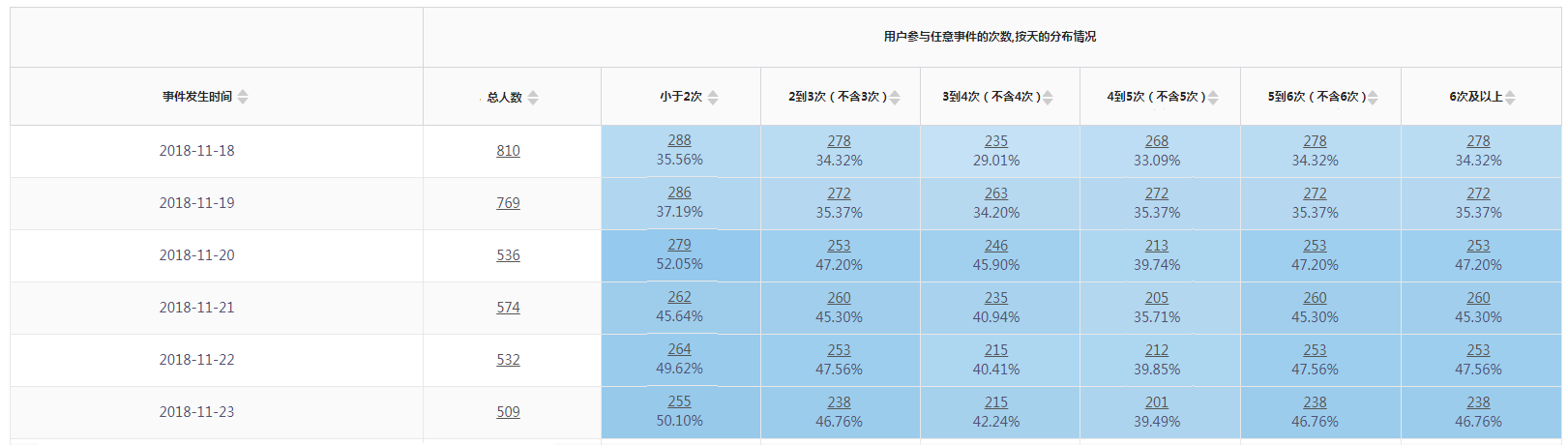 分布分析可以解决在一定时间内,指定用户完成某一事件按个人聚合后的总完成次数或属性值进行分值分类的情况。