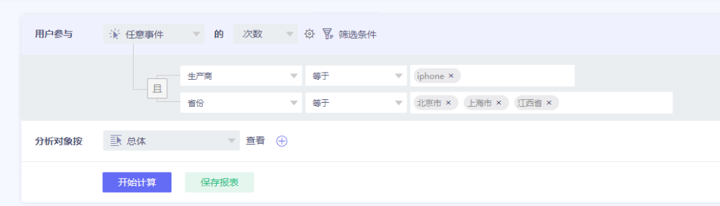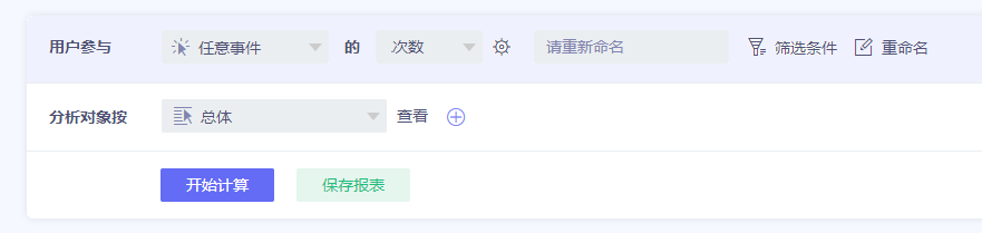 - 分析角度设定区与事件模型中相似,可设置需要分析的事件及分析角度、筛选、重命名