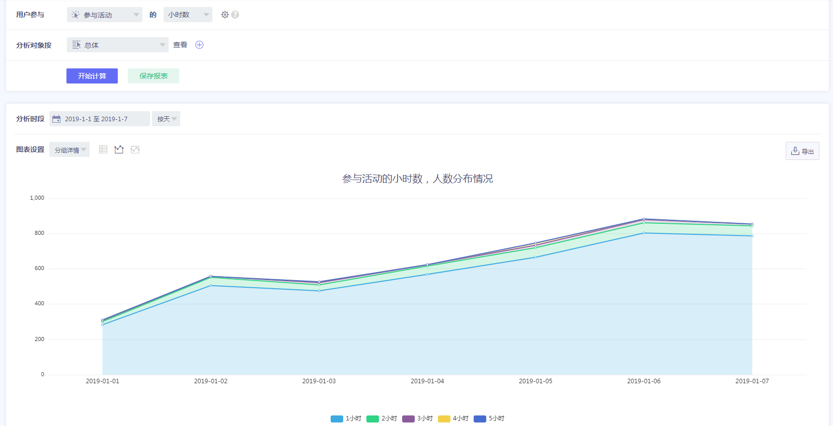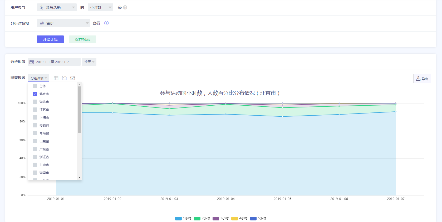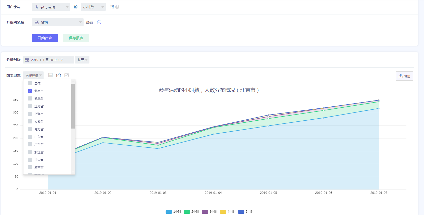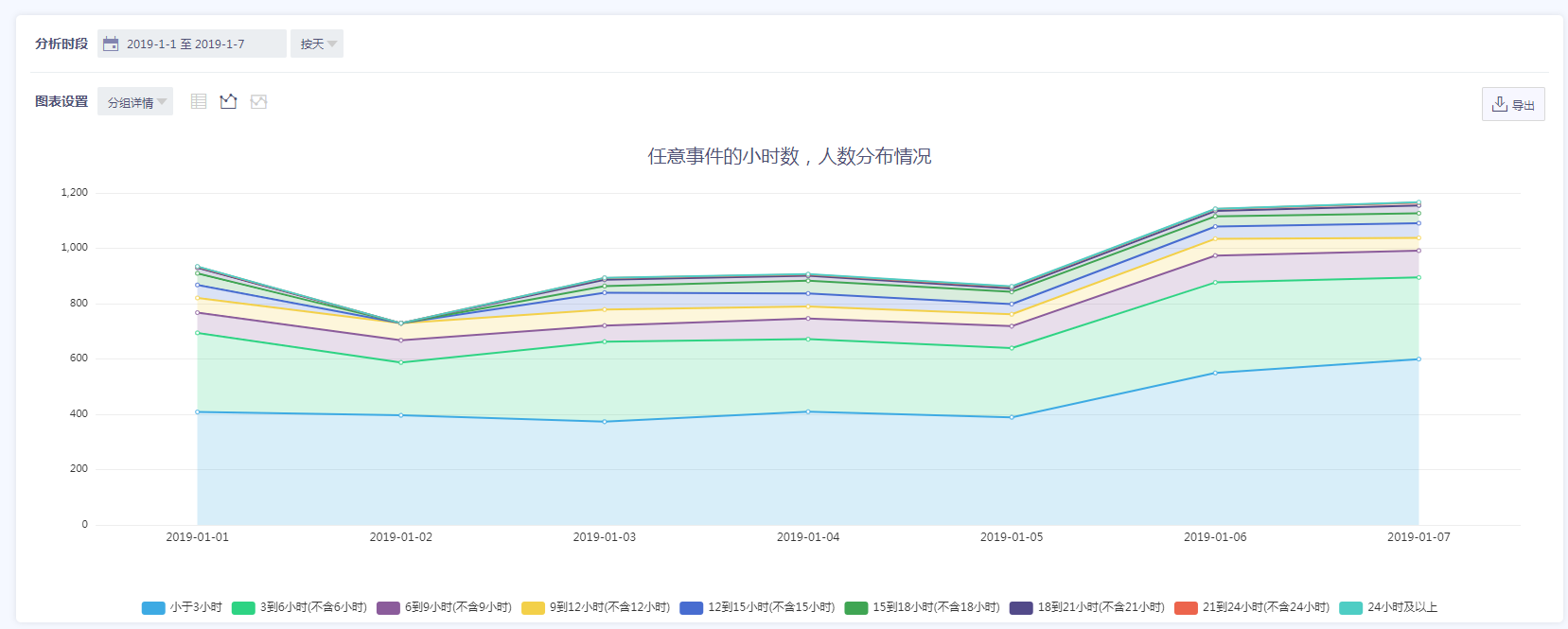 有分析时段、分析粒度、分组选中项、图表样式可供选择,可导出表格或全量下载数据。