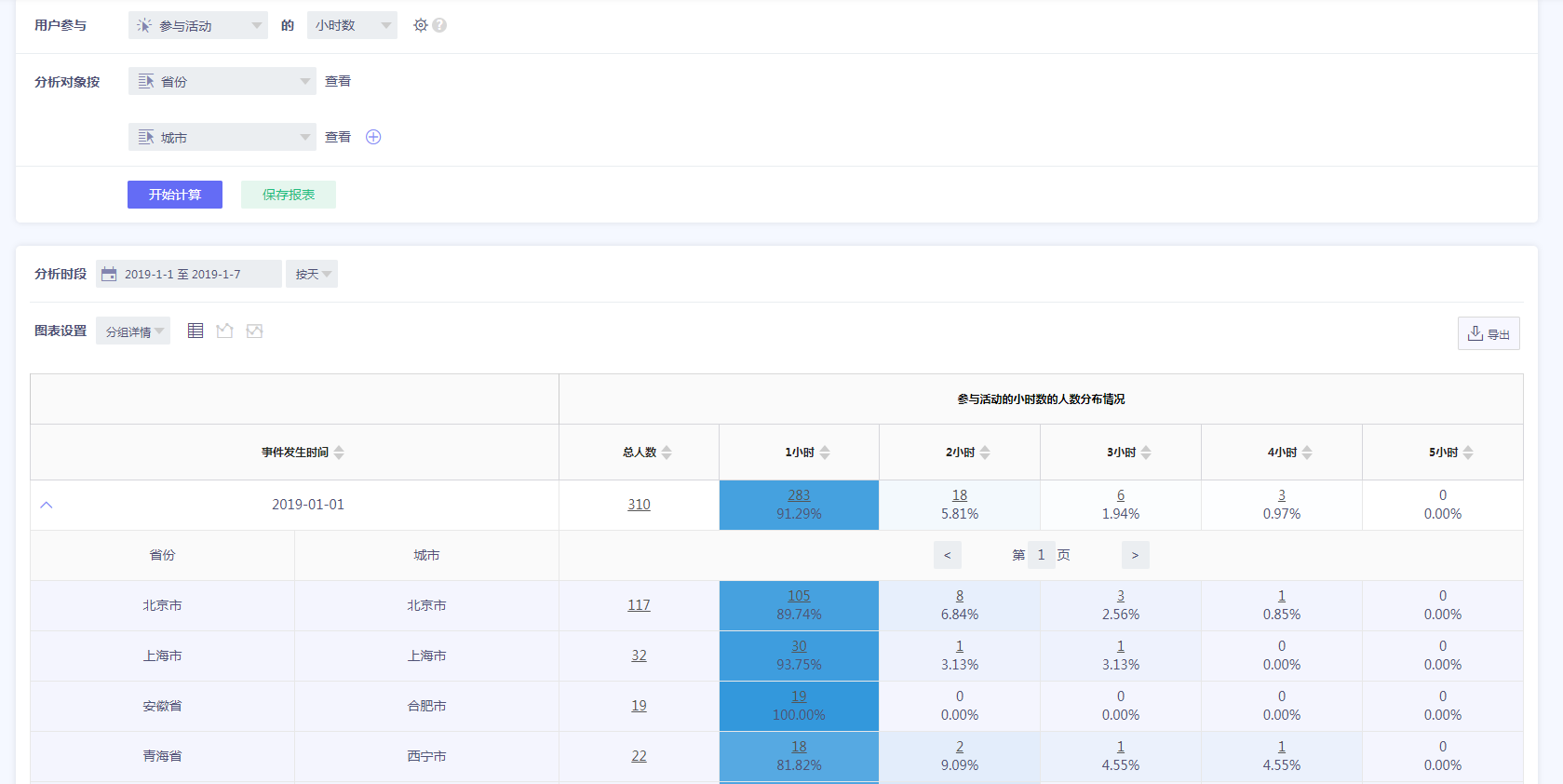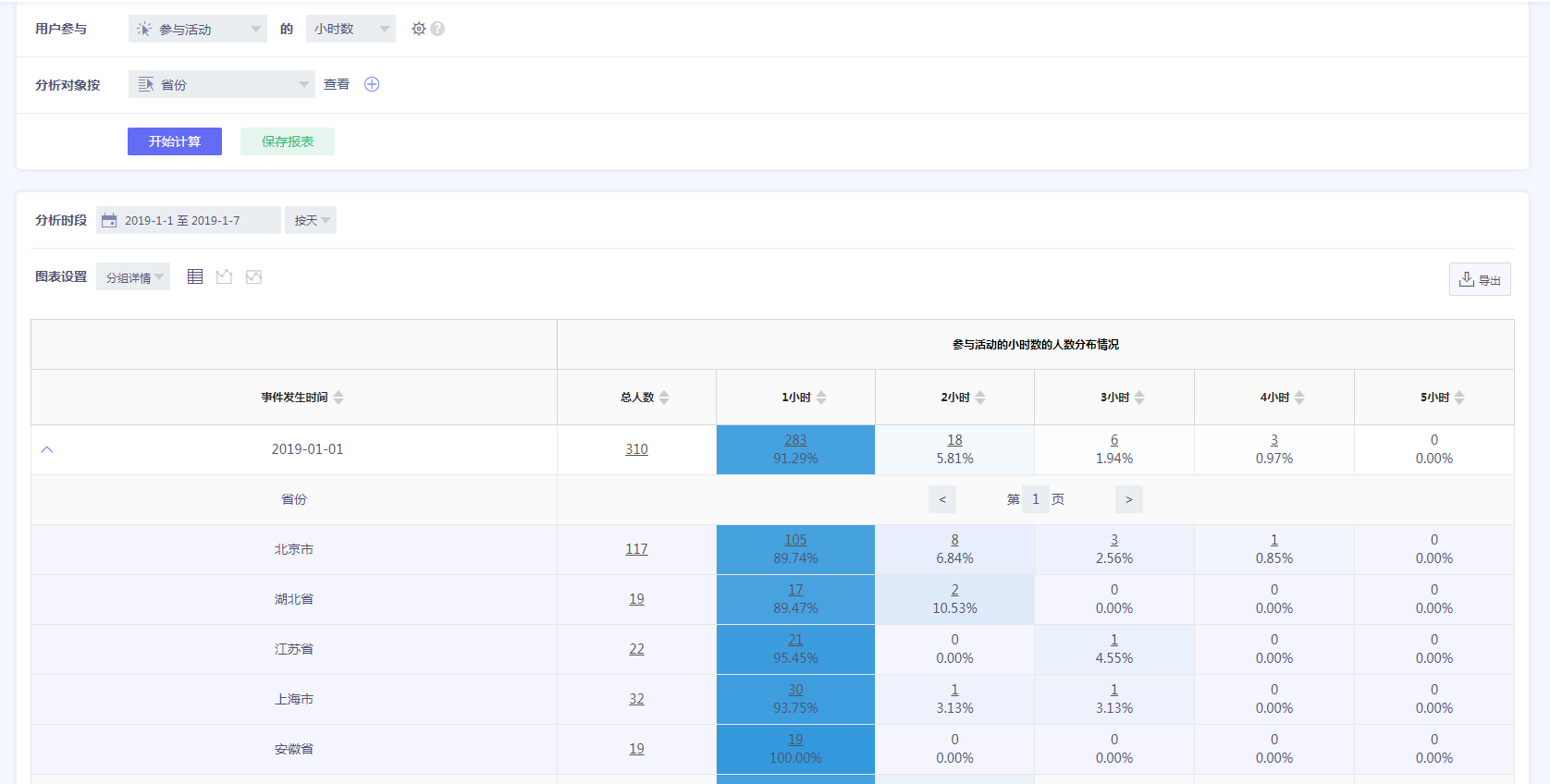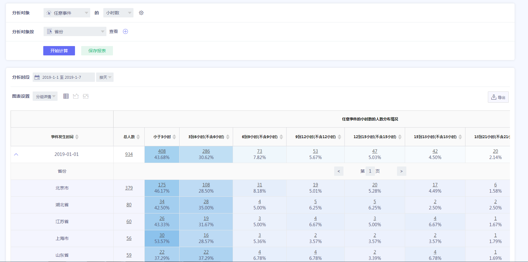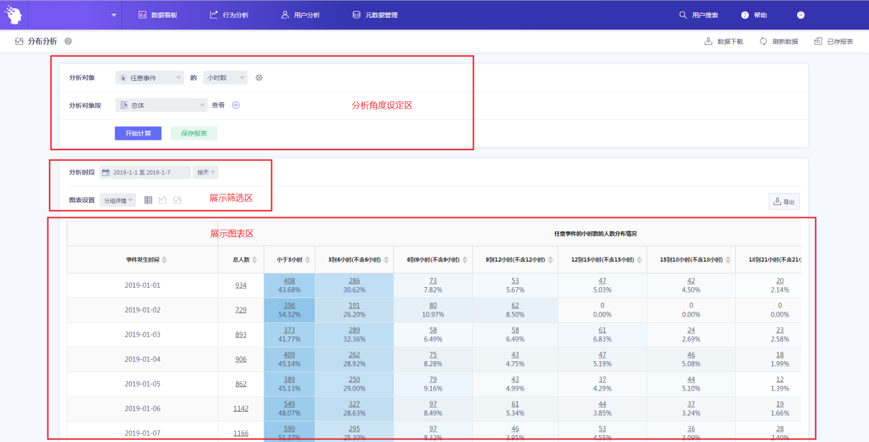 有分析时段、分析粒度、分组选中项、图表样式可供选择,可导出表格或全量下载数据。