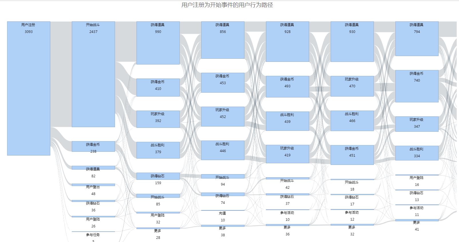 以分析某事件A为初始事件为例,行为序列为A,B,C,流失(会话内无新事件),则A为第一步,B为第二步,C为第三步,流失为第四步。