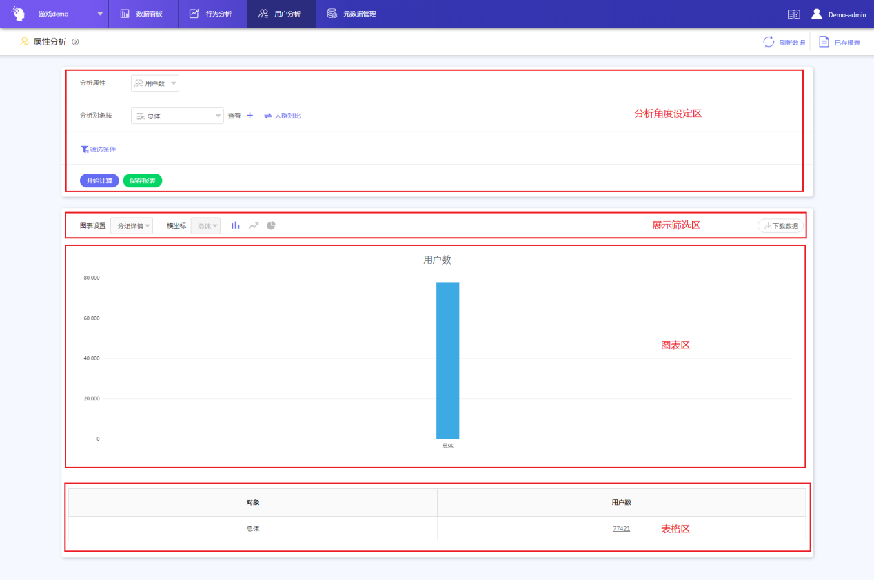 由分析角度设定区、展示筛选区、展示图表区、表格详情区,4部分组成: