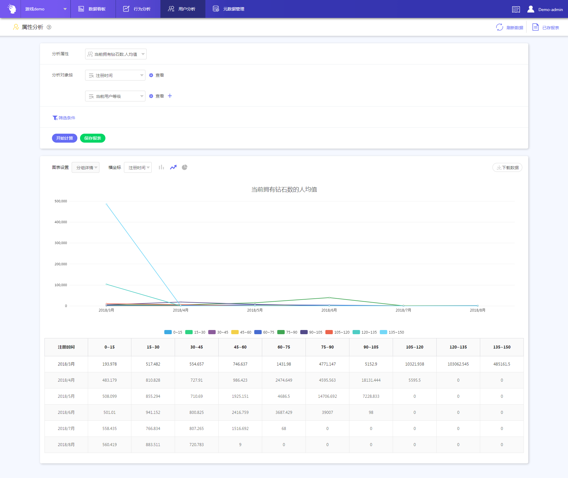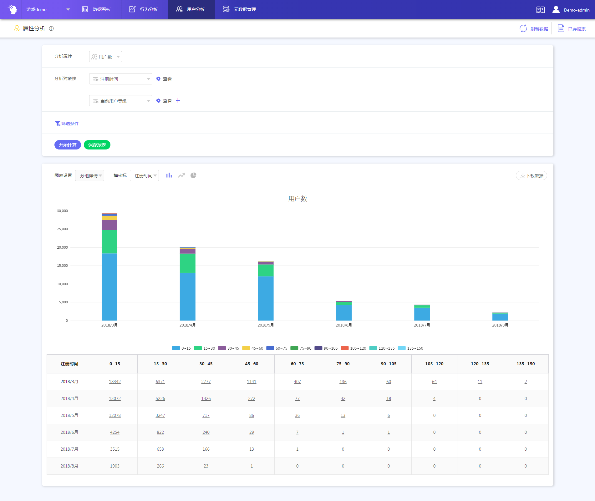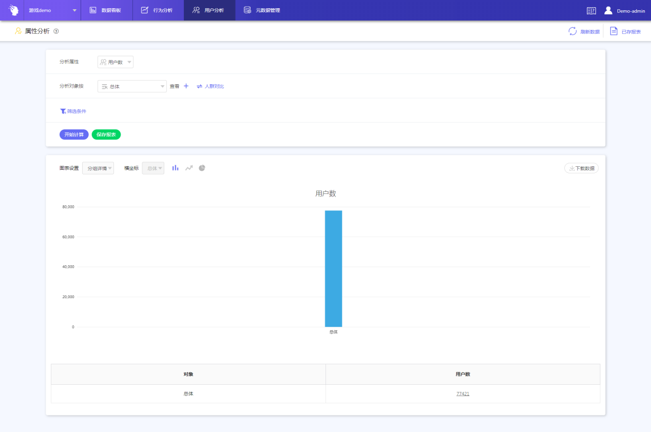 用户属性分析是一种专门分析用户属性的统计与分布情况的模型。模型按照用户属性进行归类,可以同时查看不同分组值用户的统计数与分布情况。如查看用户在各省的分布情况、用户的年龄分布情况等。可以快速描绘出整体用户群的用户画像。多角度、全方位的掌握指定用户群的特征,宏观上把握整体用户的组成与偏好,从而为精细化运营提供依据。