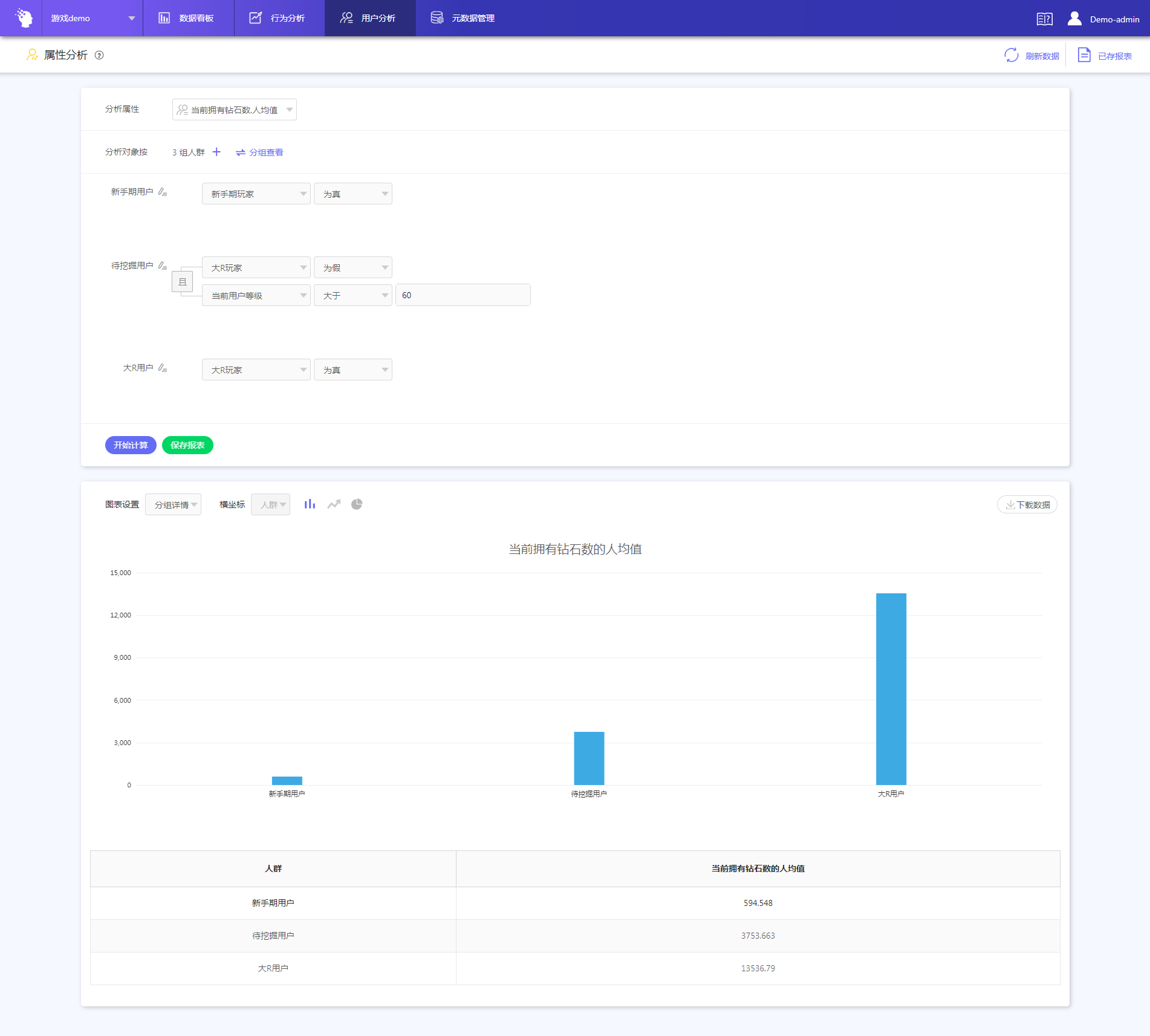 - 选择某1项进行分析,可选择“用户属性”或“用户分群”