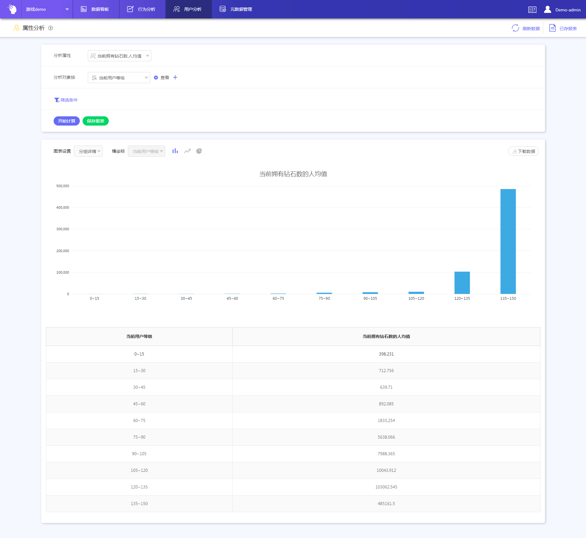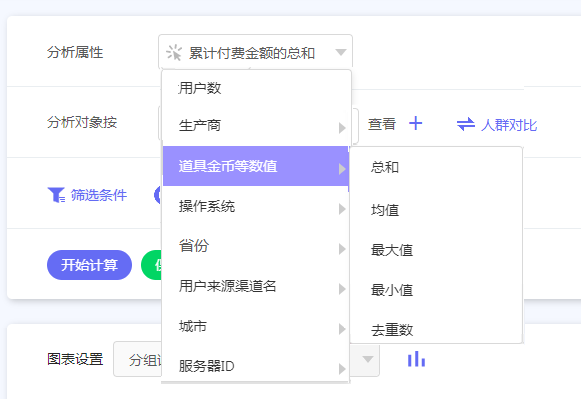 | 用户属性 | 数值 | 总和、均值、最大值、最小值、去重数 |