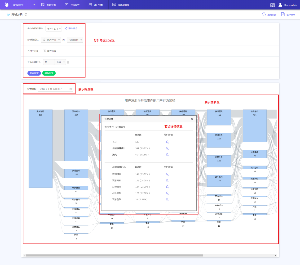 由分析角度设定区、展示筛选区、展示图表区、节点详情信息,4部分组成