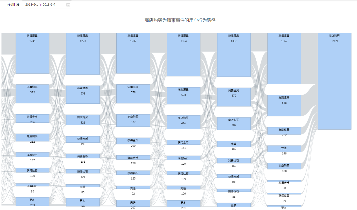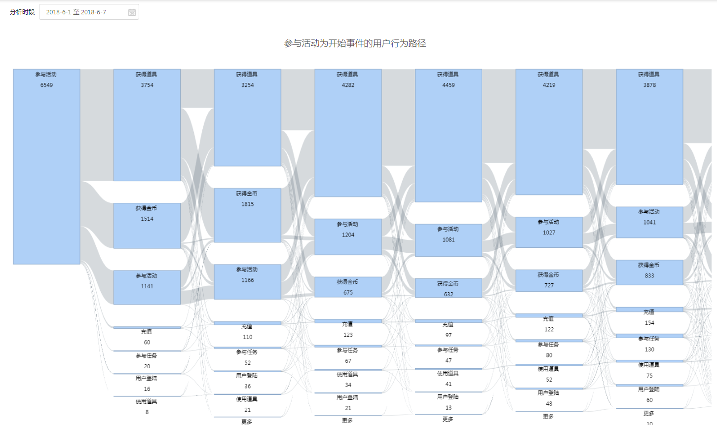 以分析某事件A为初始事件为例,行为序列为A,B,C,流失(会话内无新事件),则A为第一步,B为第二步,C为第三步,流失为第四步。