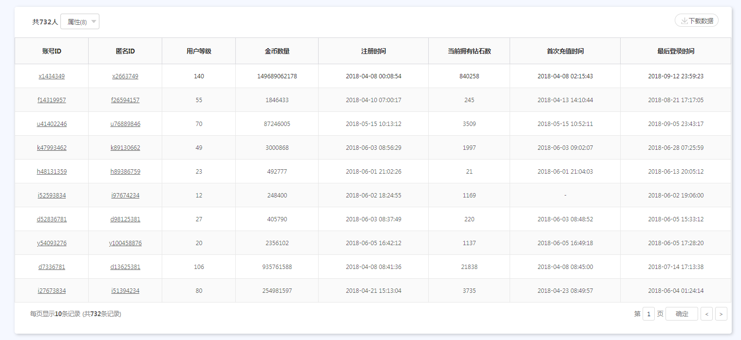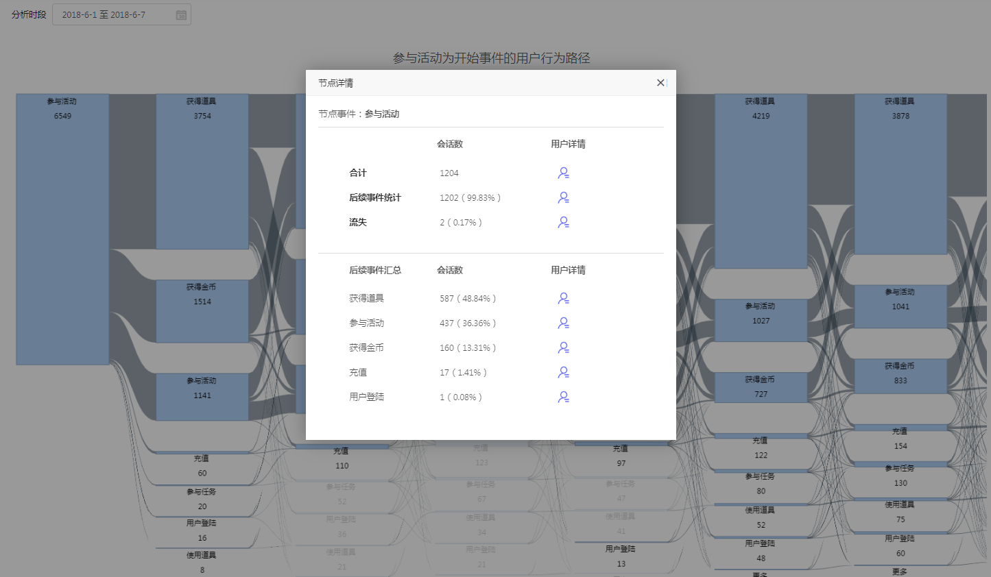 查看节点详情时,点击用户数信息,将显示符合条件的用户列表。并可以查询到相关的用户行为序列